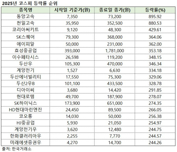 동양고속과 천일고속이 서울고속터미널 개발 호재를 계기로 지난해 유가증권시장에서 상승률이 가장 높았다. 글로벌 인공지능(AI) 산업 훈풍에 반도체 부품 업종인 코리아써키트와 SK하이닉스를 자회사로 둔 SK스퀘어도 괄목할만한 수익률을 냈다.