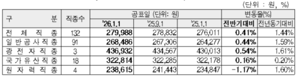 분야별로 살펴보면 가장 큰 비중을 차지하는 일반공사 직종의 임금은 26만8486원으로, 직전 반기보다 0.44%, 전년 동기 대비 1.59% 올랐다.