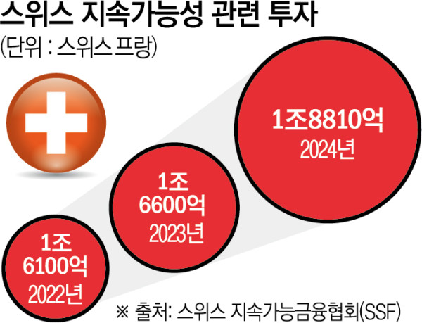 스위스 금융시장에서는 녹색 채권과 환경·사회·지배구조(ESG) 투자, 기후금융 상품 등이 빠르게 확산하고 있다. SSF의 ‘2025 스위스 지속가능 투자 시장 연구’ 보고서에 따르면 2024년 말 기준 스위스의 지속가능성 관련 투자 총액은 전년 대비 13% 성장한 1조8810억 스위스 프랑(약 3400조 원)에 달했다. 특히 테마형 지속가능 투자, 기후연계 투자, 임팩트 투자 등이 두드러지게 증가했다.