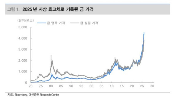 최진영 대신증권 연구원은 "금 가격은 연일 사상 최고치를 경신하며 2025년을 마무리했다"며 "미국 연방준비제도(Fed)의 정책금리 인하와 장기채에 대한 신뢰성 문제가 각국 중앙은행들로 하여금 헷지 수요를 일으킨 결과라 볼 수 있다"고 설명했다.