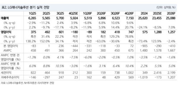 부문별 매출액은 자동차 2.7조 원, ESS 1.2조 원, 소형 2.0조 원을 전망했다. 주 연구원은 “자동차 고객 전반의 재고조정과 ESS 원가상승으로 전사 영업이익 적자전환을 예상한다”고 밝혔다.