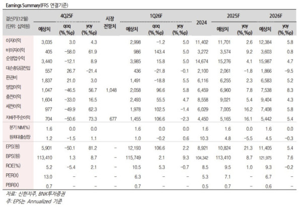 4분기 지배주주순이익은 전년 대비 73.3%인 7039억 원을 예상했다. 김 연구원은 “이자이익 증가와 시장금리 상승에 따른 채권관련손익 감소 및 배드뱅크 출자금 관련 손실 350억 원 가정에도 전년 동기 계엄에 따른 기저효과와 양호한 수수료 이익에 따라 비이자이익도 전년 대비 61.9% 증가를 예상한다”고 말했다.