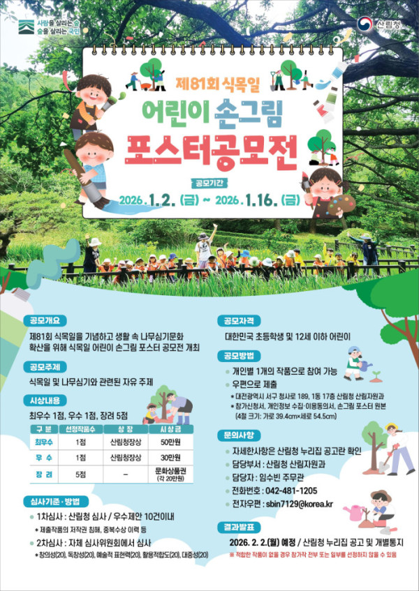 김인호 산림청장은 “이번 공모전이 다가오는 제81회 식목일을 맞아 식목일의 역사적인 의미를 모든 국민이 되새기고 숲의 소중함을 함께 나누는 기회가 되길 바란다”며 “2026년 중점추진 과제인 ‘사람을 살리는 숲, 숲을 살리는 국민’ 표어가 어린이들의 창의적인 작품으로 실현되길 기대한다”고 말했다.