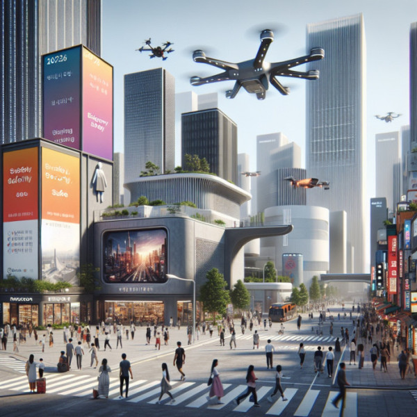 ▲도심 상공 드론과 보행 중심 거리, 복합 기능 건축물이 어우러진 안전미래형 도시 이미지는 수원특례시가 지향하는 안전스마트도시 비전을 상징적으로 보여준다. (김재 기자·오픈AI 달리)