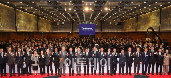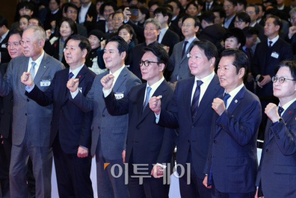 ▲김민석(오른쪽 네 번째) 국무총리와 최태원(오른쪽 세 번째) 대한상공회의소 회장 등 참석자들이 2일 서울 중구 대한상공회의소에서 열린 2026 경제계 신년인사회에서 기념촬영하고 있다. 사진공동취재단
