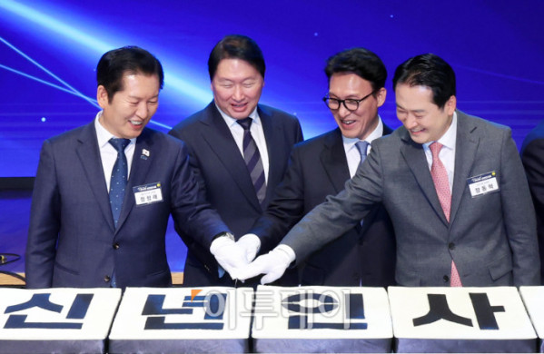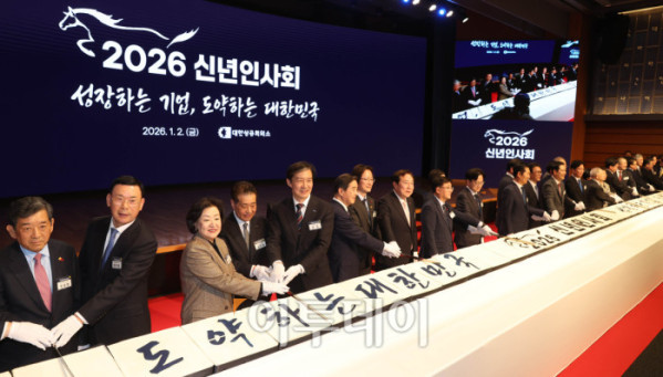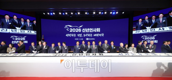 ▲김민석 국무총리와 최태원 대한상공회의소 회장 등 참석자들이 2일 서울 중구 대한상공회의소에서 열린 2026년 경제계 신년인사회에서 떡케이크를 자르고 있다. 사진공동취재단