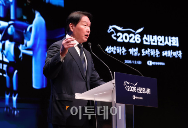 ▲최태원 대한상공회의소 회장이 2일 서울 중구 대한상공회의소에서 열린 2026년 경제계 신년인사회에서 인사말을 하고 있다. 사진공동취재단