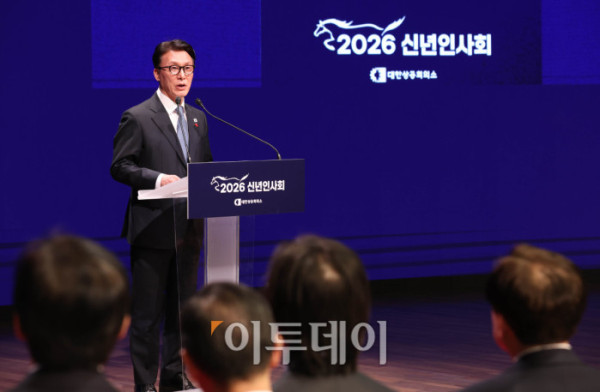 ▲최태원 대한상공회의소 회장이 2일 서울 중구 대한상공회의소에서 열린 2026 경제계 신년인사회에서 인사말을 하고 있다. 사진공동취재단