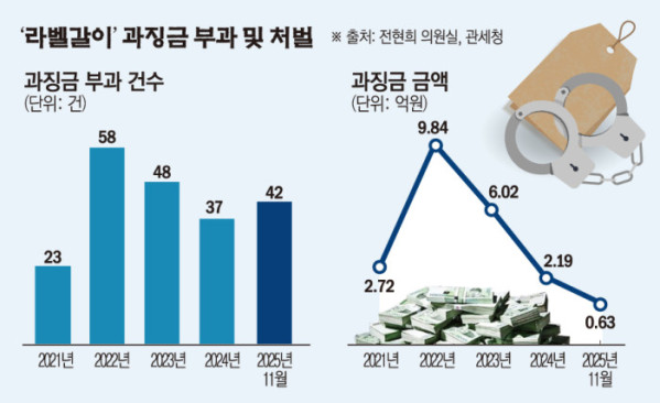 5일 전현희 의원실이 관세청으로부터 제출받은 ‘라벨갈이 과징금 부과 및 처벌’ 자료에 따르면 최근 5년(2021년~2025년 11월) 대외무역법 제33조의2(원산지표시 위반 과징금) 적용 사건으로 과징금이 부과된 사례는 총 208건으로 집계됐다. 과징금 총액은 21억4000만 원이다.