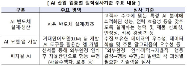 AI 분야의 글로벌 경쟁, 정부의 정책적 지원 확대‧강화 등 AI 산업 지원 필요성을 고려해 AI 산업 밸류체인별로 세부 심사기준을 마련했다.