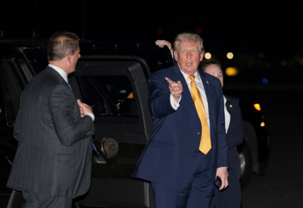 ▲도널드 트럼프 미국 대통령이 4일(현지시간) 미국 플로리다주 팜비치 국제공항에서 에어포스원 탑승을 준비하며 제스처를 취하고 있다. 팜비치(미국)/로이터연합뉴스