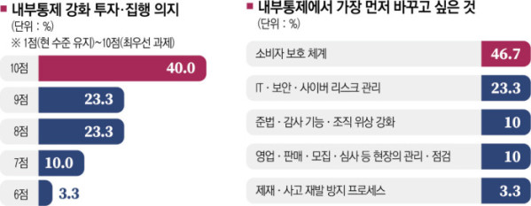내부통제 강화 의지를 점수로 평가해 달라는 질문에서도 강한 결의가 확인됐다. 응답자의 40.0%가 최고점인 10점을 선택했고, 9점과 8점도 각각 23.3%로 집계됐다. 내부통제를 단순한 관리 항목이 아닌 전사 핵심 과제로 인식하고 있다는 의미로 풀이된다.