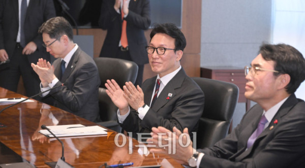 ▲김민석(왼쪽 두 번째) 국무총리와 김경수 지방시대위원회 위원장, 권창준 고용노동부 차관이 5일 서울 중구 한화오션 서울사무소에서 열린 한화오션 원·하청 상생협력 선포식에서 박수를 치고 있다. 조현호 기자 hyunho@