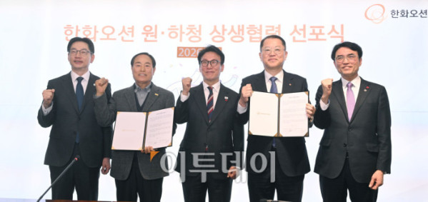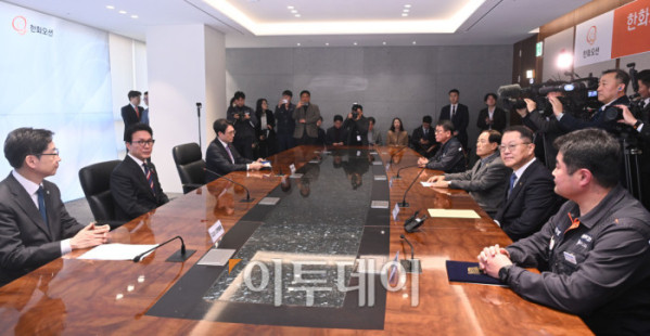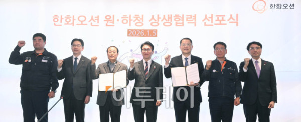 ▲김민석(왼쪽 두 번째) 국무총리가 5일 서울 중구 한화오션 서울사무소에서 열린 한화오션 원·하청 상생협력 선포식에서 참석해 있다. 조현호 기자 hyunho@