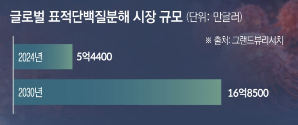 11일 바이오 업계에 따르면 TPD를 포함한 차세대 단백질 표적 치료 기술 시장은 가파른 성장세를 이어갈 것으로 전망된다. 글로벌 시장조사기관 그랜드뷰리서치는 글로벌 TPD 시장 규모가 2024년 약 5억4400만 달러(약 7800억 원)에서 2030년 약 16억8500만 달러(약 2조4400억 원)로 연평균 20.8% 성장할 것으로 전망했다.