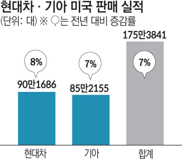 5일 현대차·기아에 따르면 지난해 미국 판매는 총 175만3841대로 집계됐다. 전년 대비 7% 증가한 수치로 양사 합산 기준 역대 최대 실적이다. 브랜드별로는 현대차가 90만1686대를 판매해 8% 성장했고 기아는 85만2155대로 7% 늘었다. 두 브랜드 모두 미국 진출 이후 단일 연도 기준 최고 판매 기록을 경신했다.