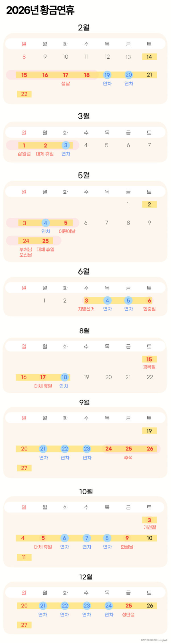 설 연휴는 2월 16일(월요일)부터 18일(수요일)이며 주말과 19일(목요일)과 20일(금요일) 연차를 이용하면 최장 9일 연휴가 가능하다.