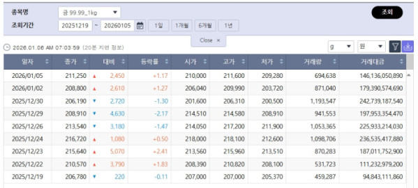 국내 금 1㎏ 가격은 지난해 말 조정을 거친 뒤 다시 반등 흐름을 보였다. 지난달 30일에는 1g당 20만6190원까지 내려갔지만, 이후 국제 금값 반등과 함께 불과 며칠 만에 5000원 이상 회복하며 21만 원 선을 재차 넘어섰다. 거래도 활발하다. 5일 하루 동안 금 1㎏의 거래량은 약 69만g, 거래대금은 1461억 원 규모로 집계됐다.