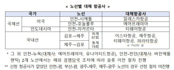 두 항공사의 인천~시애틀 노선에는 미국 알래스카항공이, 인천~자카르타 노선에는 티웨이항공이 각각 대체 항공사로 선정됐으며, 국내 노선인 김포~제주 구간에는 이스타항공, 제주항공, 티웨이항공, 파라타항공 등 4개사가 이름을 올렸다.