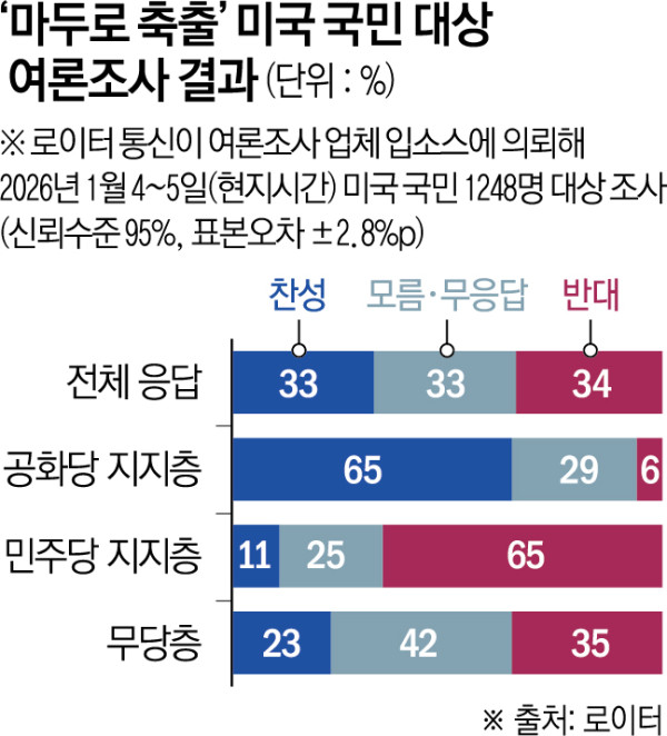 마두로 축출 군사작전에 대한 미국인의 의견은 반반으로 갈렸다. 로이터통신이 여론조사업체 입소스에 의뢰해 4~5일 실시한 여론조사에서 찬성한다는 응답은 33%, 반대는 34%를 각각 기록했고 모름·무응답이 33%였다.
