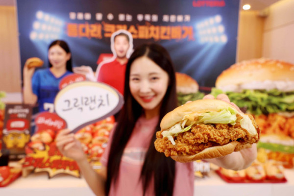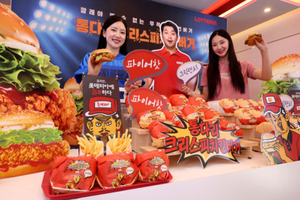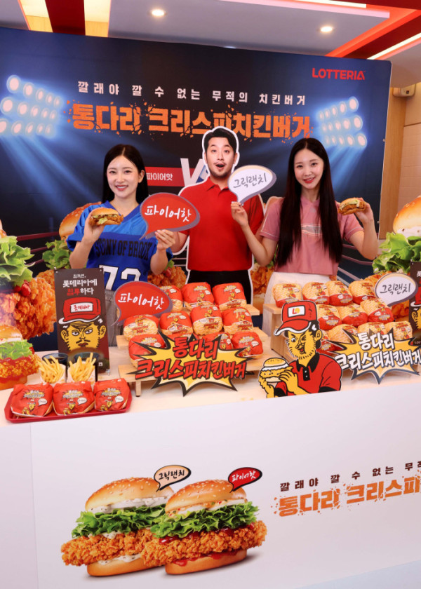 롯데 GRS의 버거 프랜차이즈 브랜드 롯데리아가 6일 서울 용산구 롯데리아 숙대입구역점에서 신메뉴 ‘통다리 크리스피치킨버거’ 2종 출시 기념행사를 갖고 있다. ‘통다리 크리스피치킨버거’는 그릭랜치와 파이어핫 두 가지 맛으로 출시됐으며 통다리살 패티에 버터밀크와 쌀가루를 더해 바삭한 식감이 특징이다.