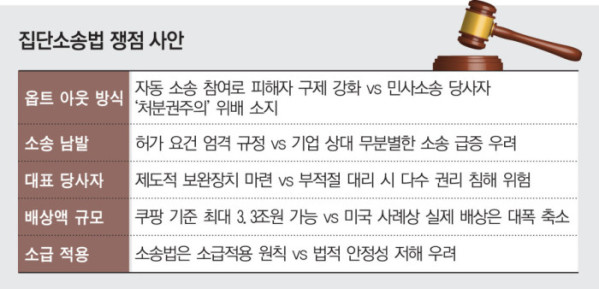 소송 남발 우려와 당사자의 대표성 문제도 제기된다. B 법무법인 변호사는 "소송 제기 문턱이 낮아져 기업을 상대로 한 무분별한 소송이 급증할 수 있다"며 "대표당사자가 피해자 집단을 공정·적절하게 대리하지 못하는 경우 다수 구성원의 권리가 침해될 위험도 있다"고 말했다.