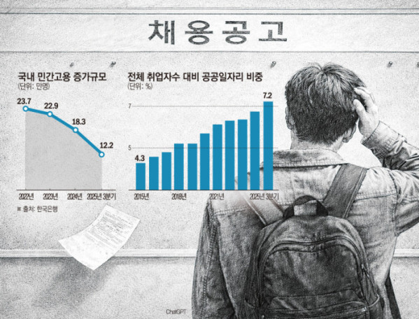 ‘고용의 질’이 빠르게 나빠지고 있다. 최근 취업자 수가 반등했지만 한국은행이 공공일자리 효과를 걷어내고 추정한 민간고용 통계에서는 한국 경제의 고용 창출력이 구조적으로 약화하고 있다는 경고가 분명해졌다. 생산연령인구 감소와 비(非)정보기술(IT) 산업 경쟁력 약화, 기술 변화가 맞물리며 일자리가 더 이상 민간에서 만들어지지 않고 있다는 것이다. 겉으로는 고용이 개선된 것처럼 보이지만 이면에서는 성장 엔진이 식고 있을 가능성이 커졌다는 진단이다.