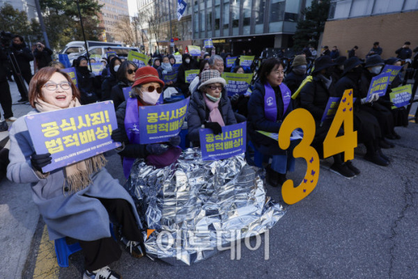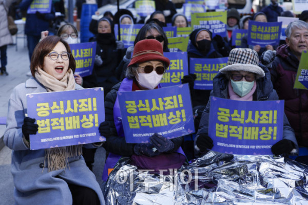 ▲7일 서울 종로구 구 주한일본대사관 앞에서 열린 1734차 일본군성노예제 문제해결을 위한 정기 수요시위에서 참가자들이 구호를 외치고 있다. 한편 서울시는 이날 오후 9시부터 서울 동북권과 서북권에 한파주의보를 발효한다. 이번 한파주의보는 서울 동북권(도봉구·노원구·강북구·성북구·동대문구·중랑구·성동구·광진구)과 서북권(은평구·종로구·마포구·서대문구·중구·용산구) 14개 자치구에 발효된다. 한파주의보 발효에 따라 서울시와 14개 자치구는 한파 종합지원상황실을 가동하고 24시간 비상근무에 돌입한다. 조현호 기자 hyunho@