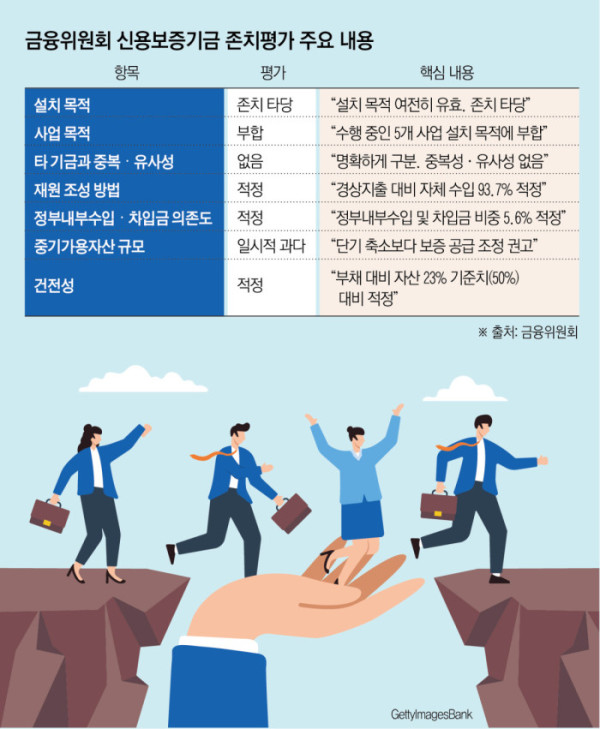 7일 금융당국에 따르면 금융위는 최근 '기금존치 평가보고서'에서 신보에 대해 "수행 중인 5개 사업 모두 기금의 설치목적과 직·간접적으로 부합돼 존치가 타당하다"고 적시했다.