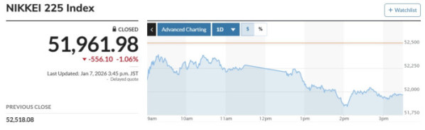마켓워치에 따르면 일본 증시 대표 지수인 닛케이225 평균주가(닛케이)는 전 거래일 대비 556.10엔(1.06%) 내린 5만1961.98엔으로 마감했다. 하락 출발한 토픽스도 하락 마감했다. 종가는 전날보다 27.10포인트(0.77%) 내려 3511.34로 거래를 마쳤다.