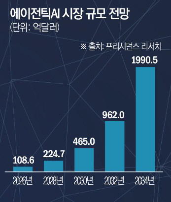 시장조사 업체 프리시던스리서치도 에이전틱 AI 시장의 폭발적인 성장세를 예상했다. 프리시던스리서치는 올해 전 세계 에이전틱 AI 시장 규모를 75억5000만 달러로 평가하고 내년 108억6000만 달러, 2034년 1990억5000만 달러까지 확대될 것으로 전망했다. 2025년부터 2034년까지 연평균 43.84%에 달하는 고성장을 기록할 것이라는 의미다.