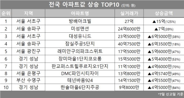 이 밖에도 경기 성남시 ‘장미마을1단지 코오롱’, ‘판교퍼스트힐푸르지오1단지’, 서울 은평구 ‘DMC파인시티자이’, 부산 수영구 ‘테넌바움924’, 경기 성남시 ‘한솔마을6단지주공’ 등이 전국 아파트값 상승 상위 10위권에 포함됐다.