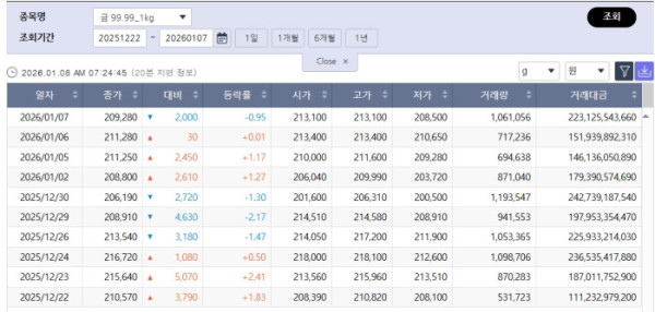 국제 금값 조정 여파는 국내 금시장 시세에도 반영됐다. 한국거래소(KRX) 금시장에서 7일 종가 기준 금 1㎏ 종가는 20만9280원으로, 전 거래일 대비 2000원(0.95%) 하락했다. 장중 고가는 21만3100원, 저가는 20만8500원을 기록했다. 거래량은 약 106만g, 거래대금은 2231억 원 규모였다.