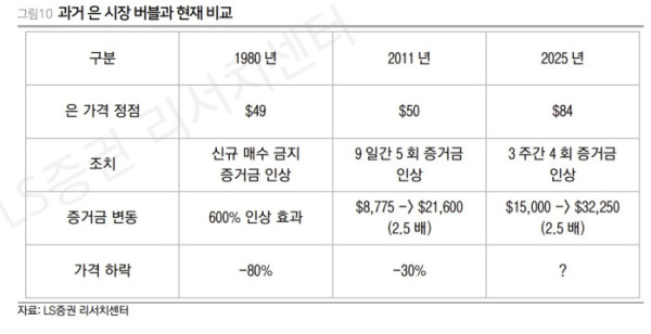 특히 추가적인 가격 상승이 나타날 경우 CME(시카고상품거래소)가 증거금을 다시 인상할 가능성이 높아 단기 급락 리스크도 상존한다고 분석했다. 과거에도 급격한 증거금 인상 이후 가격 조정이 반복됐던 만큼, 은 시장의 높은 변동성은 불가피하다는 설명이다.