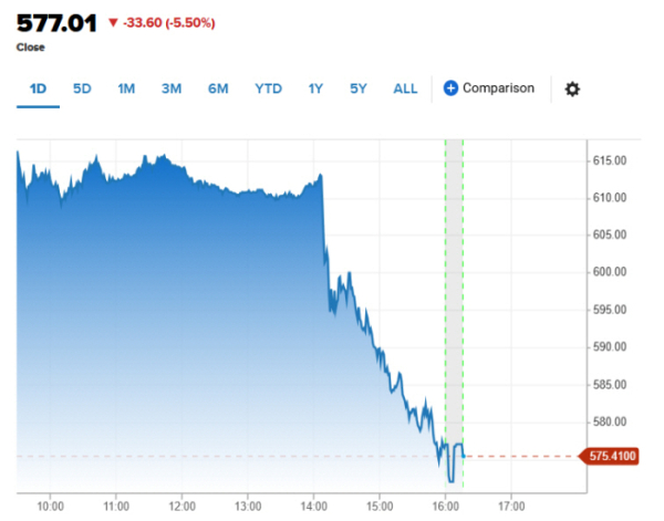 방산주 노스롭그루먼은 전 거래일 대비 5.5% 하락한 577.01달러에 마감했다. 도널드 트럼프 미국 대통령의 발언이 발목을 잡았다.