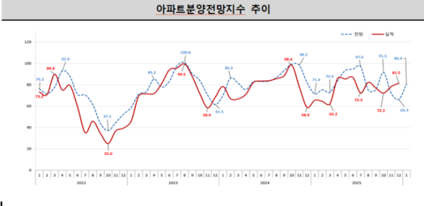1월 아파트 분양시장 전망이 전월 대비 뚜렷하게 개선된 것으로 나타났다. 다만 전국 모든 지역의 전망지수는 여전히 기준치를 밑돌며 본격적인 회복 국면으로 보긴 어렵다는 평가다.