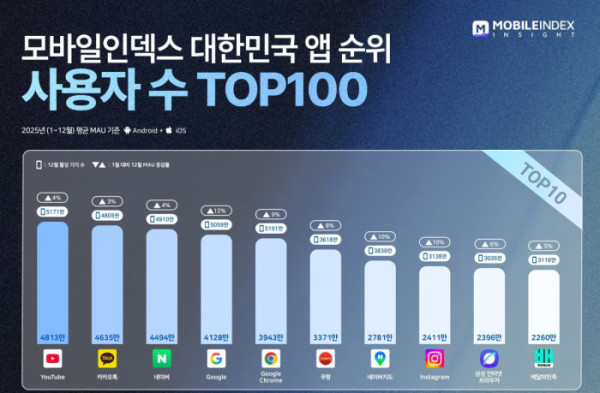 8일 데이터 기업 아이지에이웍스 모바일인덱스가 공개한 ‘2025 대한민국 모바일 앱 순위’ 리포트에 따르면 작년 1월부터 12월까지 유튜브의 평균 MAU는 4813만 명으로 1위에 올랐다. 이어 카카오톡(4635만 명), 네이버(4494만 명), 구글(4128만 명) 등이 평균 4000만 명이 넘는 MAU를 기록하며 흔들림 없는 시장 지배력을 입증했다. 특히 구글의 작년 12월 MAU는 1월 대비 12% 증가했다.