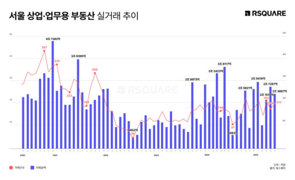 연중 흐름을 보면 서울 상업·업무용 건물 시장의 회복 기조는 유지되고 있다. 올해 1월(6063억 원·91건) 저점을 지나 상반기부터 거래가 점진적으로 확대됐고, 9~10월에는 거래규모 중심의 회복이 나타났다. 11월에는 규모가 일부 조정됐지만 거래 건수가 늘어나며 일부 회복 국면이 이어졌다.