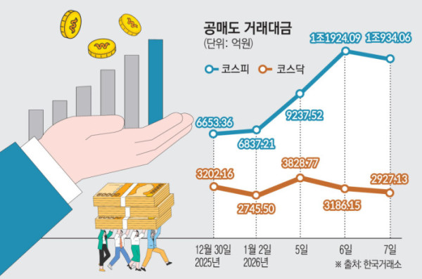 이 사이 공매도 거래대금은 급증했다. 공매도 증가는 시장이 과열 구간에 진입했다는 신호로 읽힌다. 변동성 확대 요인으로 해석될 수도 있다. 전날 기준 공매도 거래대금은 코스피 1조934억 원, 코스닥 2927억 원으로 집계됐다.