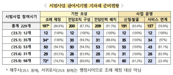 복지부에 따르면 2일 기준 전국 시·군·구의 91.3%인 209곳이 통합돌봄 전담인력 배치를 완료했다. 전담조직을 설치한 곳은 200곳(87.3%)이다. 지역별 준비 속도에는 편차가 있다. 시범사업에 일찍 참여했던 광주와 대전은 관할 전 지역에서 조례 제정 및 조직 구성을 완료하고 실질적인 서비스 연계 단계에 돌입했다. 반면, 지난해 9월 이후 합류한 98개 시·군·구 중 38곳은 아직 대상자 발굴 실적이 전무해 남은 2개월여간 집중적인 노력이 요구된다.