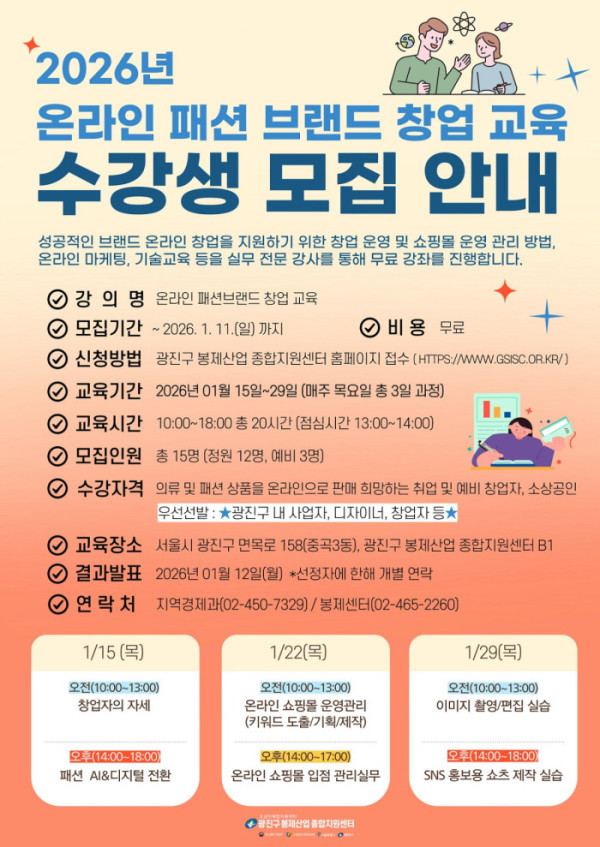 광진구 봉제산업종합지원센터가 주관하는 이번 교육은 관내 패션 분야 예비 취업·창업자와 봉제소공인 등을 대상으로 하며, 창업 전반에 필요한 실질적인 역량을 높일 수 있도록 마련됐다. 의류·패션 시장 분석부터 온라인 쇼핑몰 운영 실무, 홍보 전략까지 실제 온라인 판매에 바로 적용할 수 있도록 교육 과정을 구성했다.