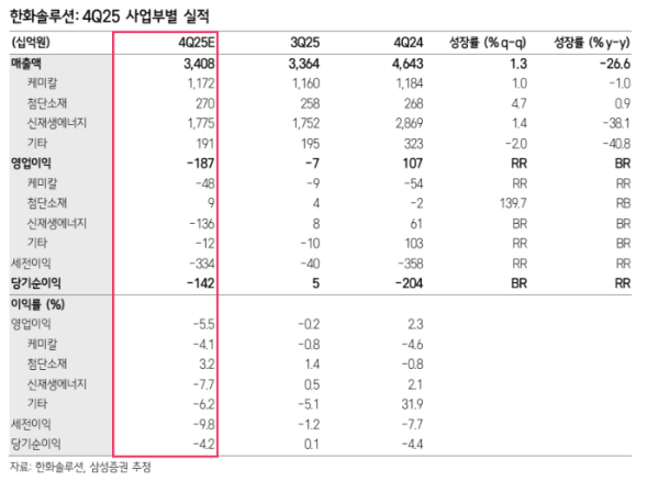 조현렬 삼성증권 연구원은 "한화솔루션의 지난해 4분기 영업이익은 -1873억 원으로 컨센서스 하회를 예상하는데, 이는 화학 및 태양광 이익 감소에 기인한다"라며 "영업이익은 -477억 원 예상하는데, 이는 정기보수, 주요 제품 스프레드 감소 및 원가 하락에 따른 부정적 재고효과가 원인"이라고 전했다.