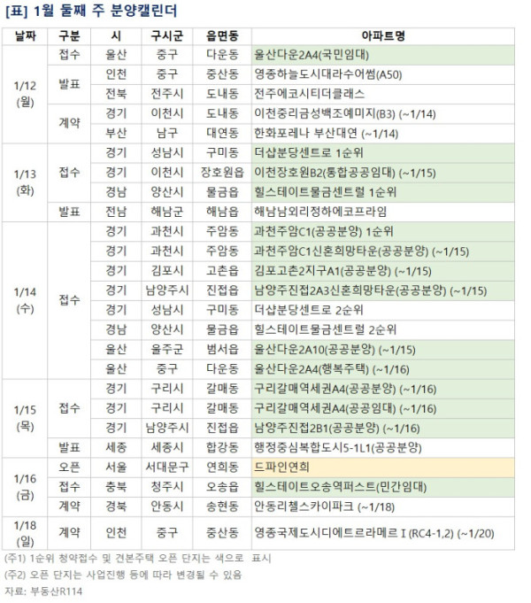 ▲1월 둘째 주 예정된 분양 관련 일정. (부동산R114)