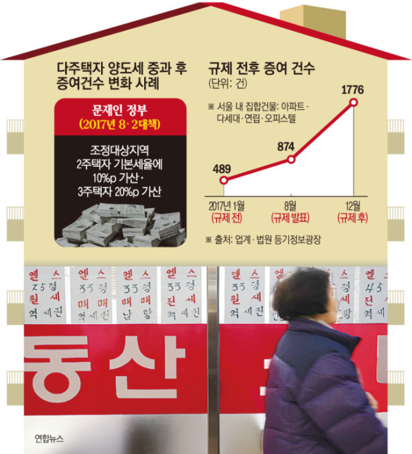 이 기간 주택 증여도 크게 늘었다. 법원 등기정보광장에 따르면 2017년 1월 서울 내 집합건물(아파트·다세대·연립·오피스텔) 증여 건수는 489건을 기록했지만 8·2대책이 나온 8월 874건을 기록하며 규모가 크게 늘었고 12월에는 1776건까지 증가했다. 증여 건수는 △2018년 1월 1133건 △2월 1080건 △3월 2452건 등 양도소득세 중과가 시행된 2018년 4월 전까지 전년 대비 큰 폭으로 늘었다.