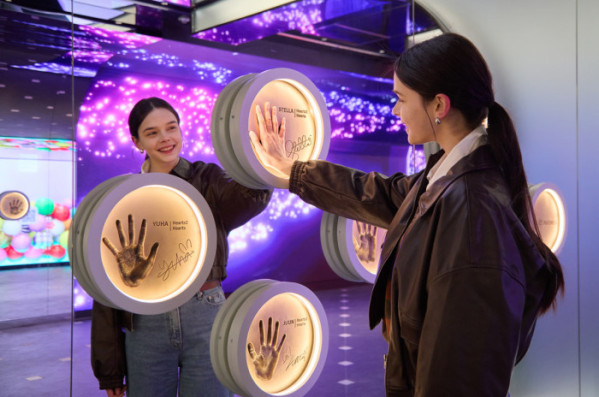▲한 외국인 관광객이 롯데면세점 '스타에비뉴' 스타에비뉴 입구 양쪽에 있는 하이파이브 존에서 롯데면세점 신규 모델 걸그룹 '하츠투하츠'의 핸드프린팅에 손을 마주대며 즐거워하고 있다. (사진제공=롯데면세점)