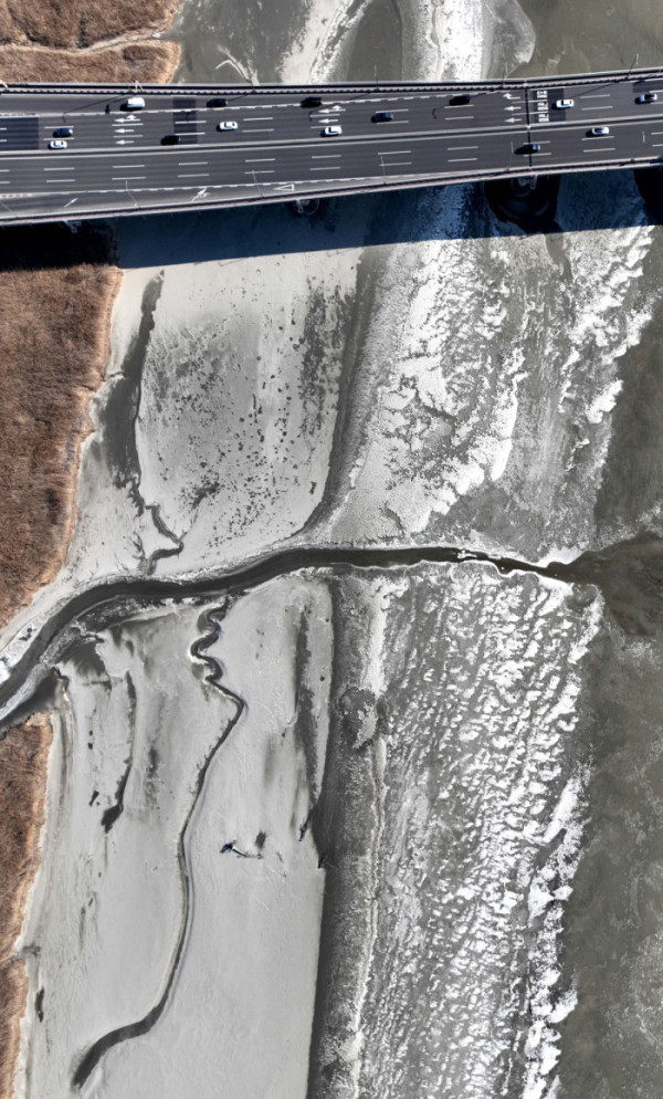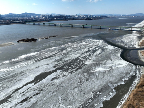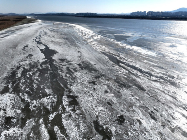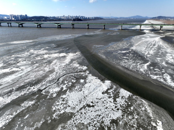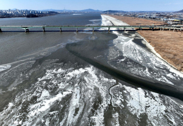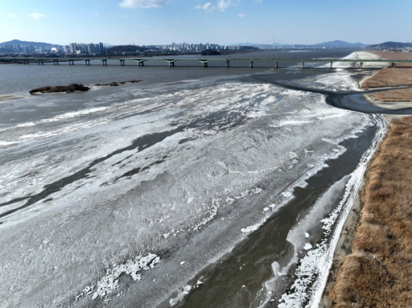 전국 곳곳에 한파특보가 발효된 11일 경기 고양시 일산대교 북단 인근의 한강이 얼어붙어 있다. 기상청은 12일에도 영하 10도 안팎의 강추위가 기승을 부릴 것으로 전망했다.