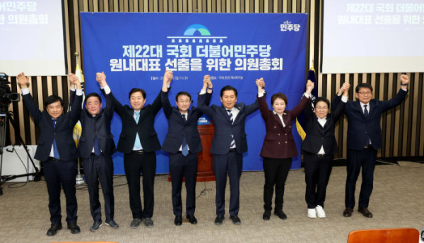 ▲한병도 더불어민주당 신임 원내대표와 최고위원들이 11일 서울 여의도 국회에서 열린 원내대표 선출 의원총회에서 손을 들고 인사하고 있다. 왼쪽부터 이성윤·강득구 신임 최고위원, 한병도 신임 원내대표, 문정복 신임 최고위원. 신태현 기자 holjjak@
