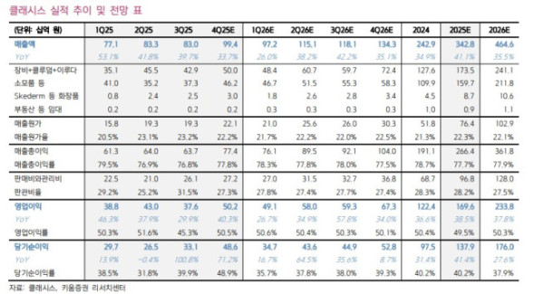 키움증권은 클래시스가 지난해 4분기 매출액 994억 원, 영업이익 502억 원을 기록했을 것으로 전망했다. 전년 동기 대비 각각 33.7%, 40.3% 증가한 수준이다. 신민수 키움증권 연구원은 "국내 장비 관련 지난해 3분기와 유사하게 이루다 인수 후 제품 포트폴리오로 합류한 마이크로 니들 RF 장비 '쿼드세이', 레이저 장비 '리팟'의 국내 판매세가 견고하다"며 "장비 판매 성장률 성숙기에 접어든 HIFU 장비 '슈링크 유니버스'와 RF 장비 '볼뉴머'도 영업에 큰 문제가 없는 것으로 판단한다"고 말했다.