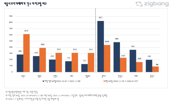 12일 직방이 서울시 토지거래허가 내역을 분석한 결과, 지난해 10월 20일부터 11월 28일까지 40일간 허가 건수는 5252건이었다. 이후 40일(11월 29일~2026년 1월 7일)에는 5937건으로 13% 늘었다.