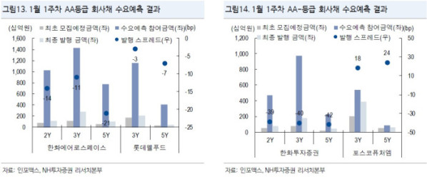 실제로 연초 진행된 한화에어로스페이스, 롯데웰푸드, 한화투자증권 등 우량 발행물들의 경우 모집액을 웃도는 주문을 받으며 민평금리를 하회하는 수준에서 발행됐다. 다만, 화학·이차전지 등 최근 업황이 부진한 포스코퓨처엠은 민평금리보다 20bp 가량 높게 형성되며 발행이 이뤄졌다.